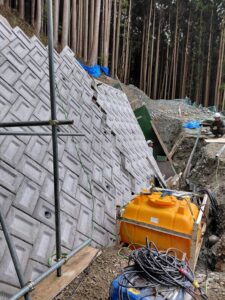 堂の谷の山地砂防の管理用道路らしくはまだ成って来てはいないですが、ブロック積み工が後僅かで完了です。