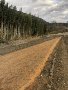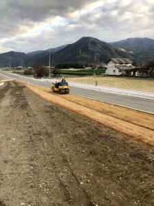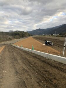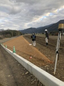 芝張が本日完了致しまして出来形を若手二人が切磋琢磨して測っております。