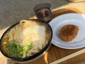かなり有名との事で釜玉うどんを頼み、ジャガイモの天ぷらは無かったため行列に並んでる時に見たコロッケ3個購入していた人がいたためコロッケを1つ頼みました。